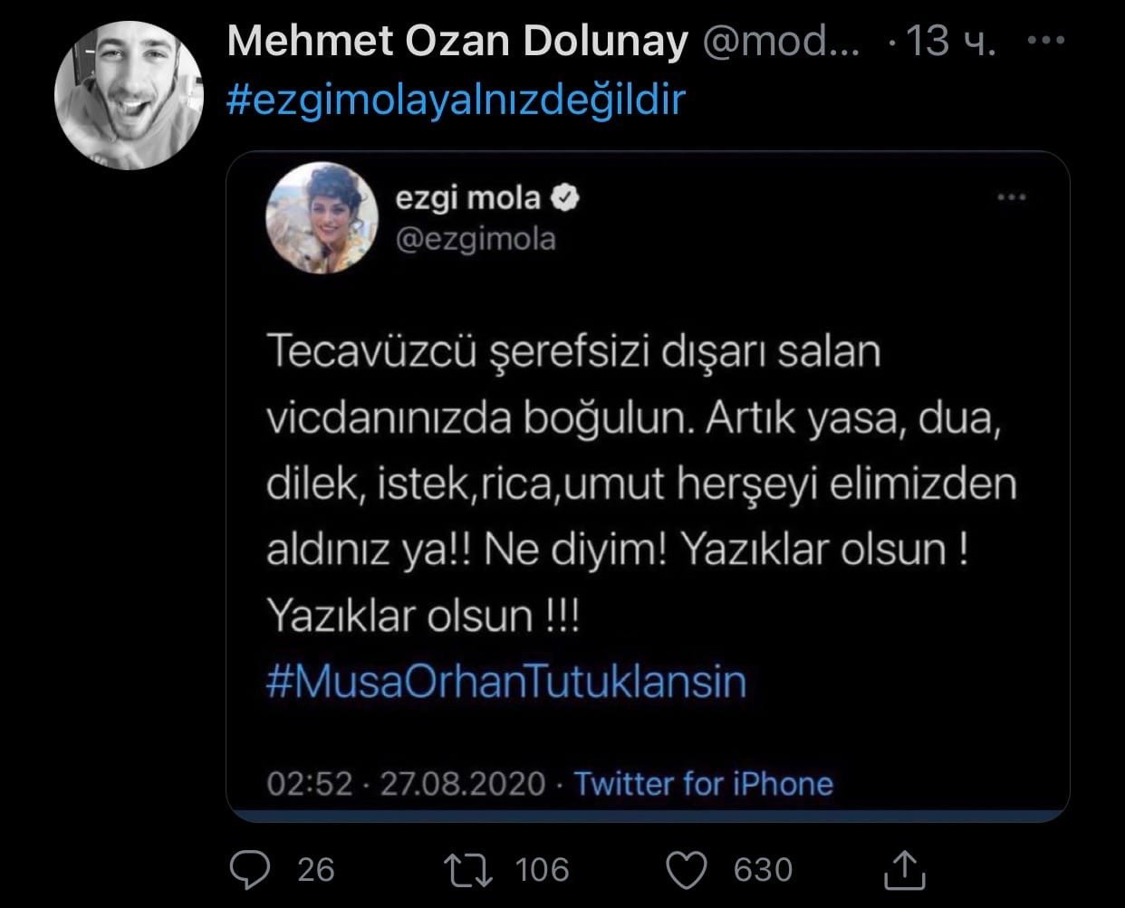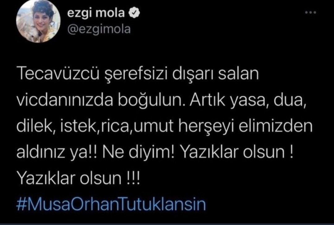 Прокуратурата поиска 2-години и 4-месеца затвор за актрисата Езги Мола за критика към Муса Орхан, който беше обвинен в изнасилване на 18-годишното момиче Ипек Ер. След инцидента момичето се самоуби. В самоубийствената си бележка тя пише, че е била изнасилена от г-н Орхан. Изнасилвачът е задържан, но след това освободен. Езги изпрати възмутен туит относно освобождаването на изнасилвача, който поиска актрисата да бъде наказана за обида в социалните мрежи. Адвокатът на Муса Орхан предложи на Езги Мола да се извини за публикуването на публикацията с обиди срещу клиента му в замяна на отпадане на обвиненията, но Мола отхвърли тази оферта. Също така адвокатът на Орхан подаде жалба до прокуратурата срещу 16 известни личности, които подкрепиха актрисата.