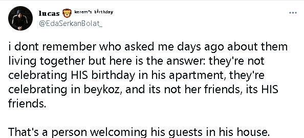Те не празнуват НЕГОВИЯ рожден ден в апартамента му, а празнуват в Бейкоз (там се намира новият дом на Ханде), и не с нейните приятели, а с неговите приятели.
