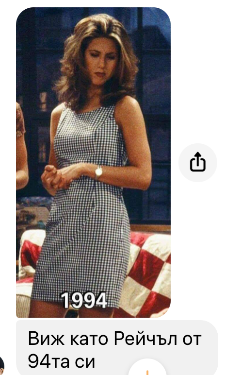 Тьорти, изглеждаш прекрасно, хич не им се връзвай на децата! Аз лично нямам нищо против да ме сравняват с Рейчъл от "Приятели"... ама не ме сравняват. Sad