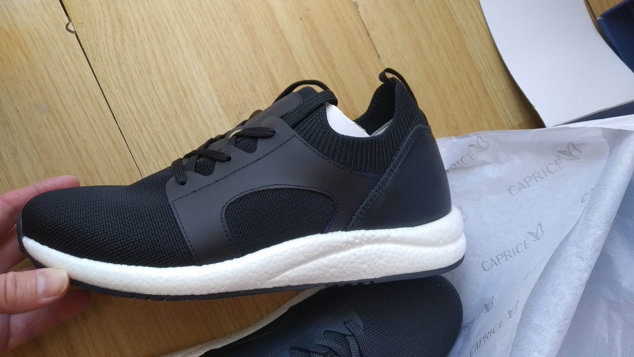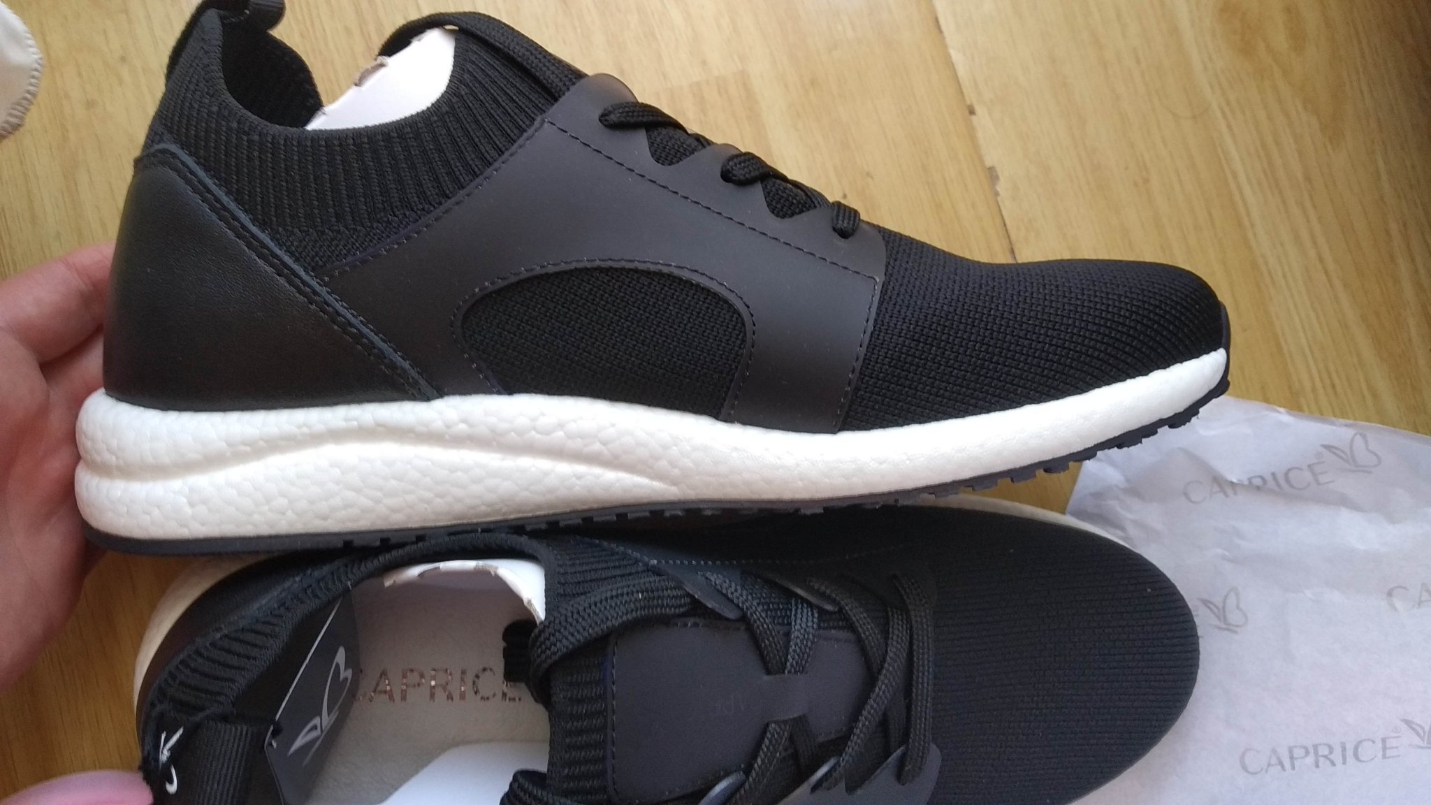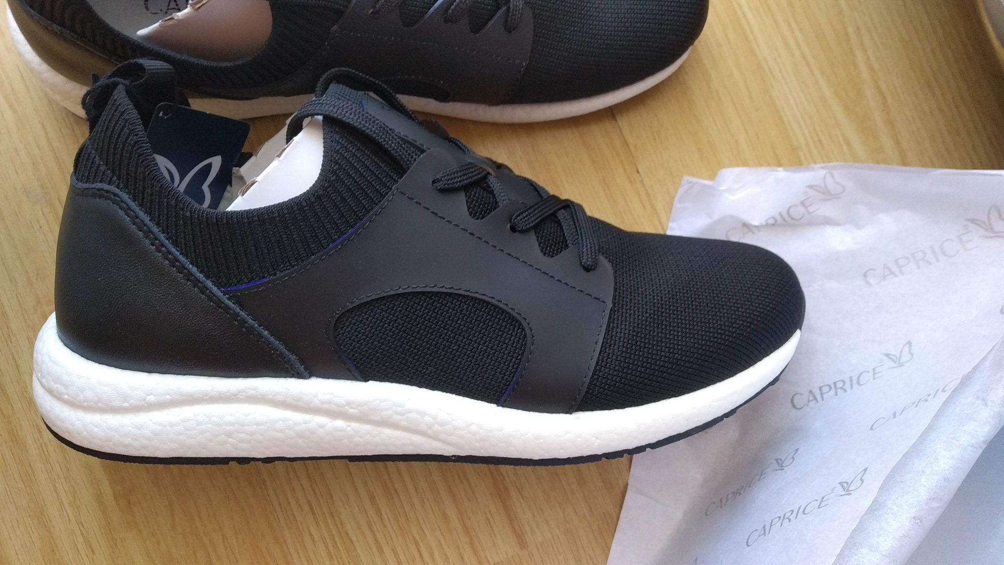 Дамски спортни обувки Caprice, 38 номер, черен цвят, отговарят си, дължина на стелка 24.5 см, текстил и естествена кожа, стелка естествена кожа. Обувките са подходящи за ПО-ТЕСЕН КРАК, ширина на стъпалото G. Много са лекички и удобни и много хубаво стоят на крака. Поръчах два чифта, но реших да се разделя с единия.