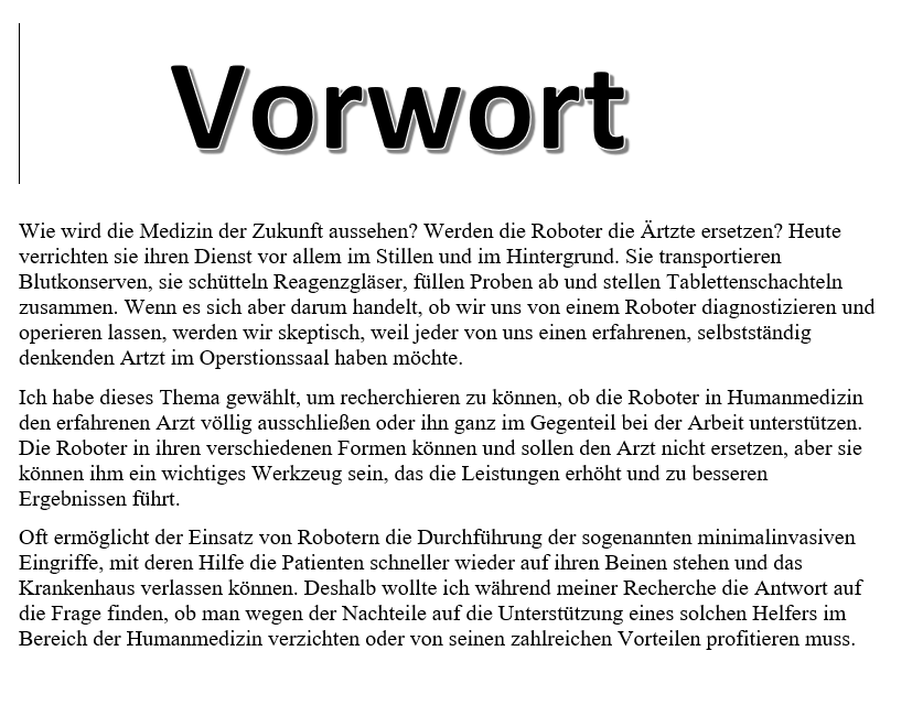 Следваща страница - Нямам идея какви са изискванията в момента. При голямата ми дъщеря и при малките беше  различно. При голямата имаше общ увод по голямата тема, оформен от хората с подтеми  на главната. Примерно ако главната е цитираният по-горе изкуствен интелект, в този общ увод има обяснения как Иван ще разгледа роботите в операционната зала, Петър - тези в автомобилостроенето, а Мария - тези  с приложение в домакинството. При малките такъв увод нямаше, помня, че г-н Мюнх изрично им каза, че немският отдел е приел да  го махнат. Но има индивидуален Vorwort, в който детето обяснява защо е избрало тази тема.