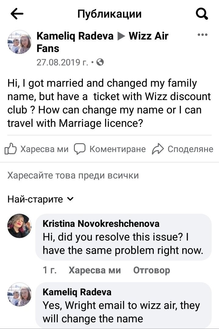"АЗ И ПАРТНЬОРКАТА МИ ТОКУ-ЩО РЕЗЕРВИРАХМЕ ПОЛЕТ, НО КЪМ МОМЕНТА НА ПЪТУВАНЕТО ВЕЧЕ ЩЕ СМЕ СКЛЮЧИЛИ БРАК, А РЕЗЕРВАЦИЯТА СЪДЪРЖА МОМИНСКОТО ИМЕ НА ЖЕНА МИ. КАКВО ТРЯБВА ДА НАПРАВИМ?