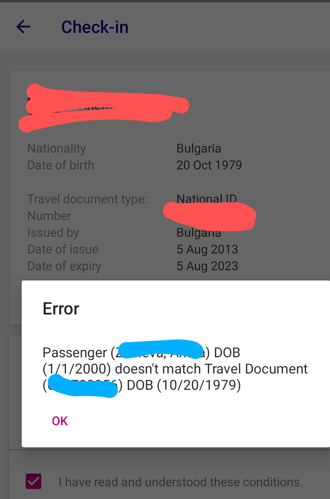 Опитвам се да се чекирам за полет на 1.10, през приложението, с random seat (безплатно). След като си въведа дата на раждане, документ за самоличност с дата на издаване и на валидност и натисна бутона за потвърждение, ми излиза това съобщение:
