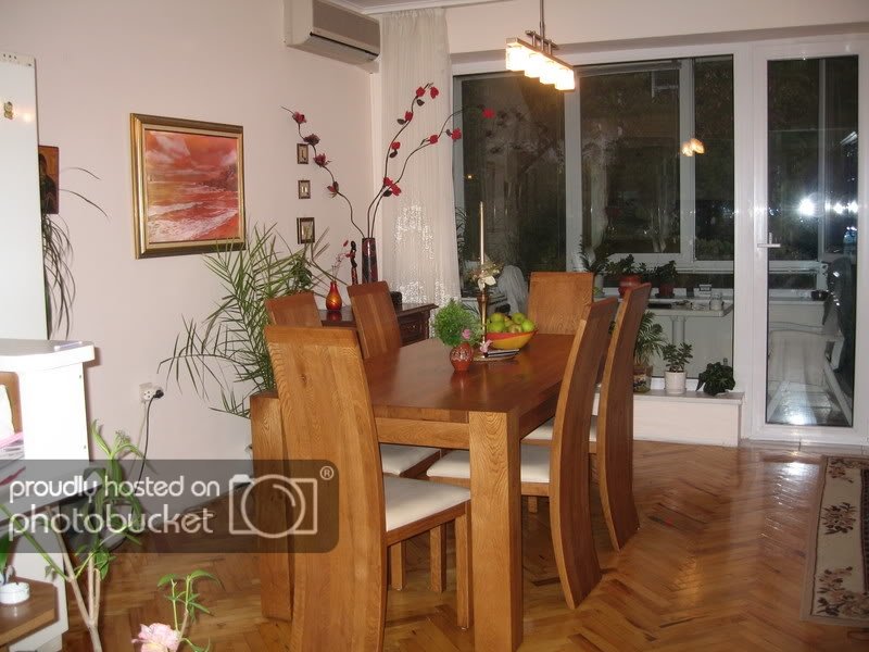 Трапезария с прозорци на 2/3 ЮЗ . Където е са червенире рози е ЮГ. От трапезарията поглед в дневната: Телевизора и картината са в ъгъла , който сичи на запад.Прозореца отново е на 2/3 ЮЗ. Трапезария и дневна от друг ълъл , където се вижда колона . Мисля че съм я подобрила с Бенджамина.