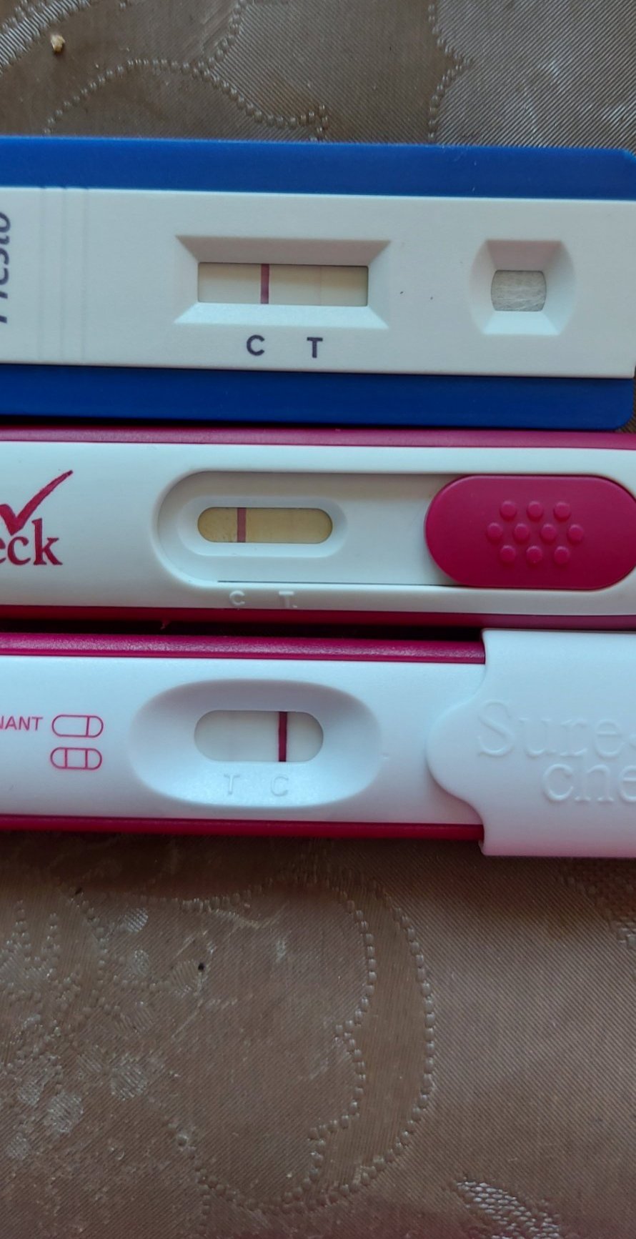 Първо, като ще правиш няколко теста, се правят от един и същи модел, т.к. реактивите вероятно са различни на различните модели. Иначе виждам бледи черти и на трите, но не е нормално да не се насища и да е все еднаква на цвят и то на 4 дена закъснение. Вероятно е било биохимична, но все пак не губи надежда, може и да е късна О, пусни 2 кръвни през 48 часа и обсъди резултатите с лекар.