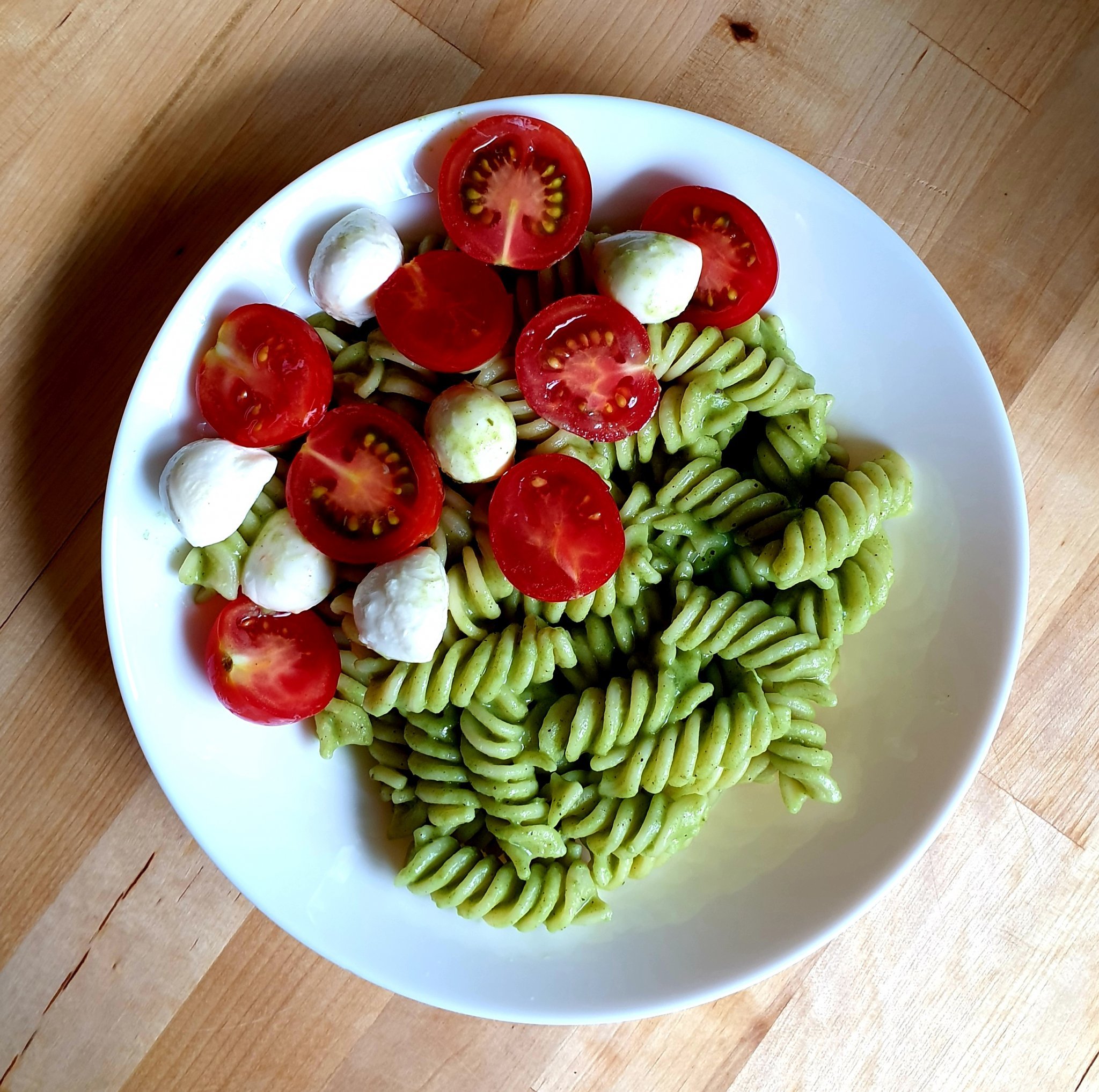 От мен днес охладена паста с песто, моцарелка и чери за обяд