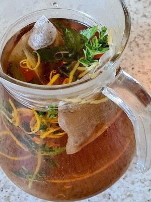 Кана студен чай с китки мента и майорана, и портокалови и лимонови изрезки