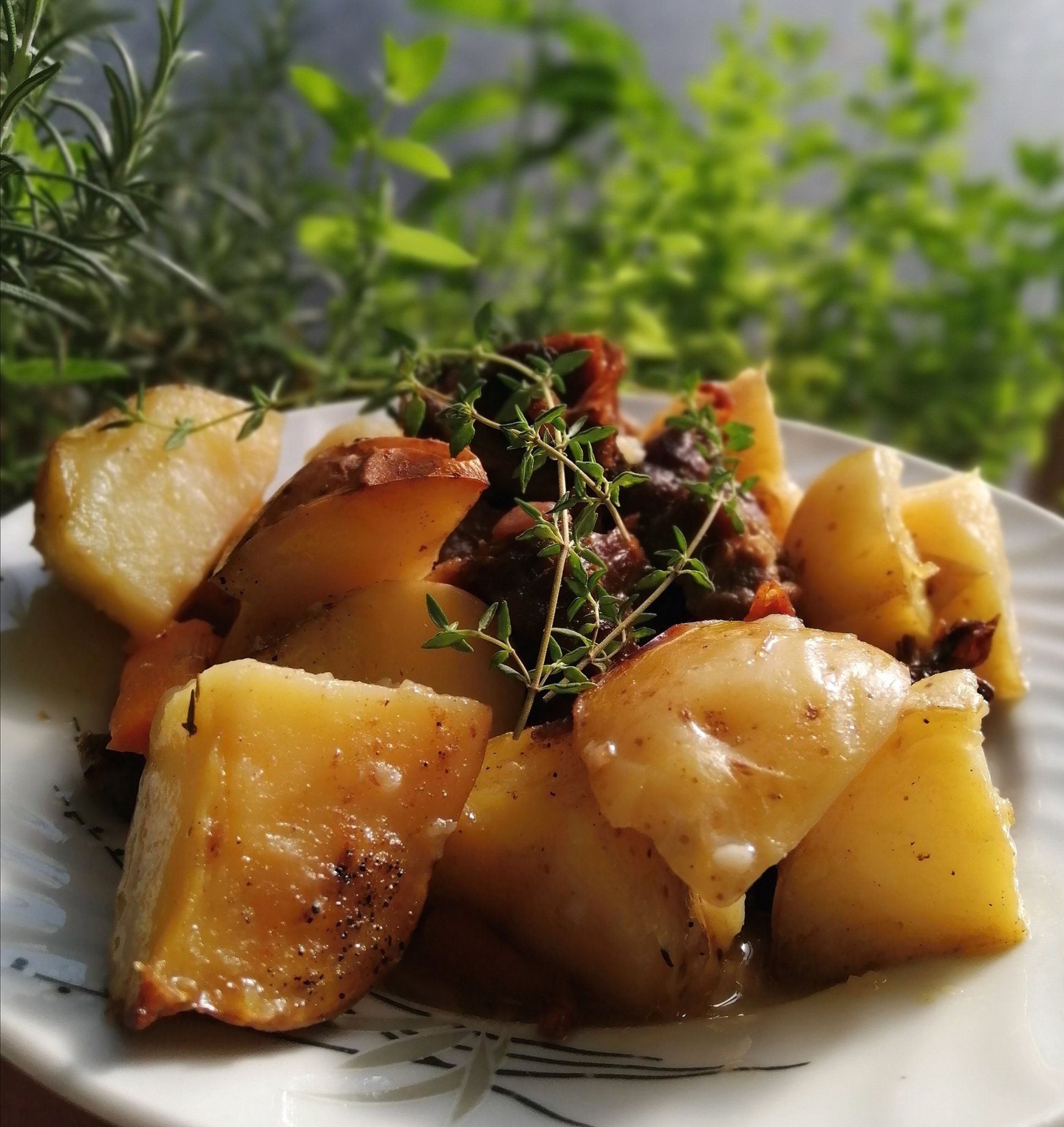 И телешко(не купешко) с картофи, лук, морков и прясна балконска мащерка. Подчертавам: прясна мащерка!, Манчев четеш ли, прясна мащерка!!! Искам си десятката и плакета. Ако някой не е разбрал, мащерката е не само прясна, ами и домашна Joy :