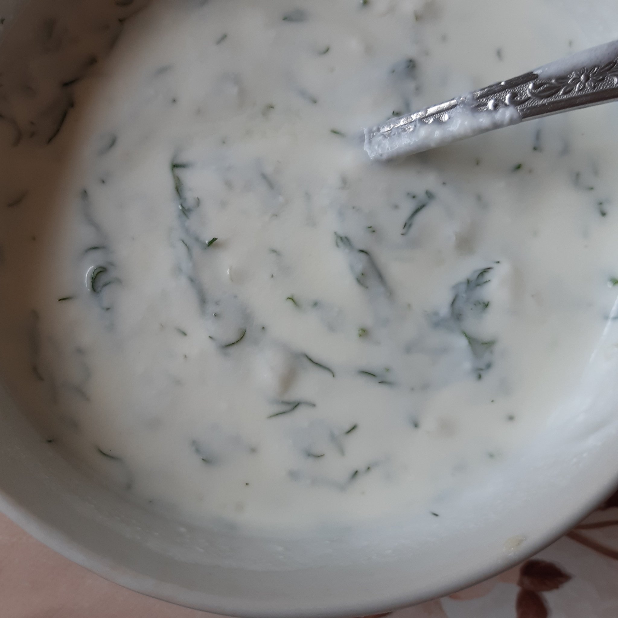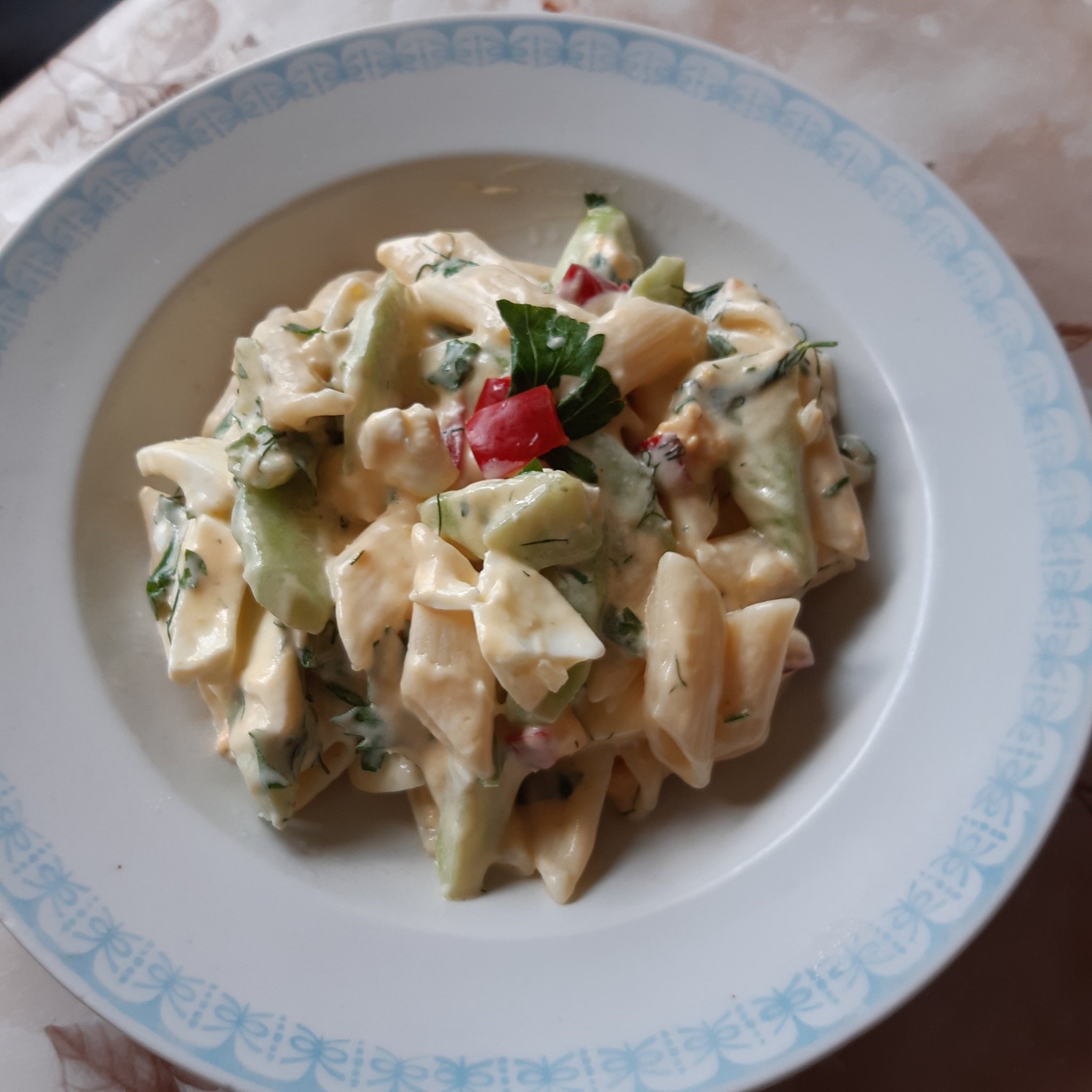 За вечеря хрупкави тиквички на фурна с бяло и царевично брашно и чесново кис. мляко с копър,  салата с макарони, постна майонеза, варени яйца, краставица, червена чушка, горчица, пасиран чесън, магданоз и копър.