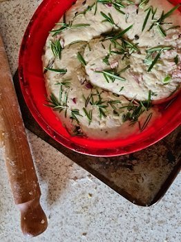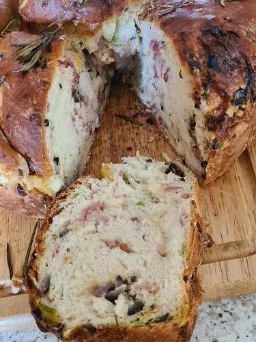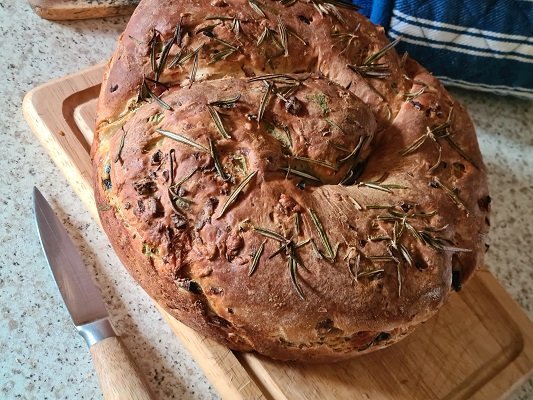 Хлебче със саламчета, маслини, сиренца. Тесто с мащерка въртях в машината, отгоре е розмарин.