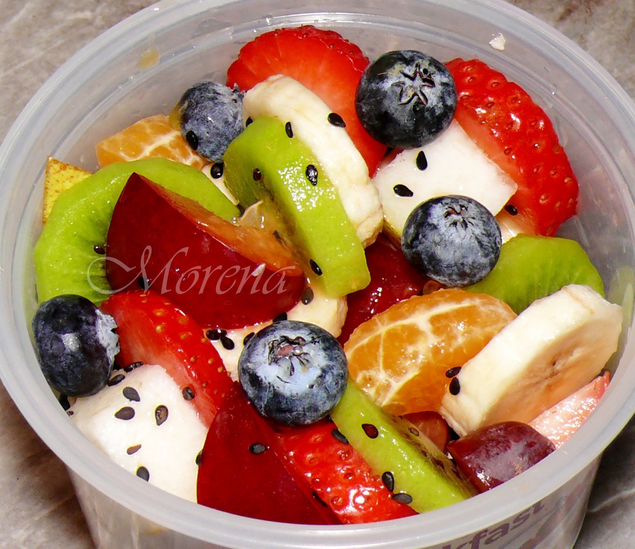Плодова салата - банан, слива, мандарина, папая, манго, киви, грозде и боровинки с медно-джинджифилов дресинг с кардамон и лайм