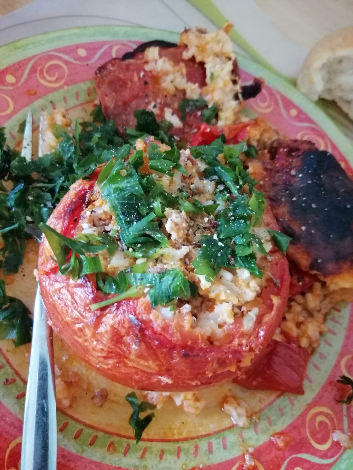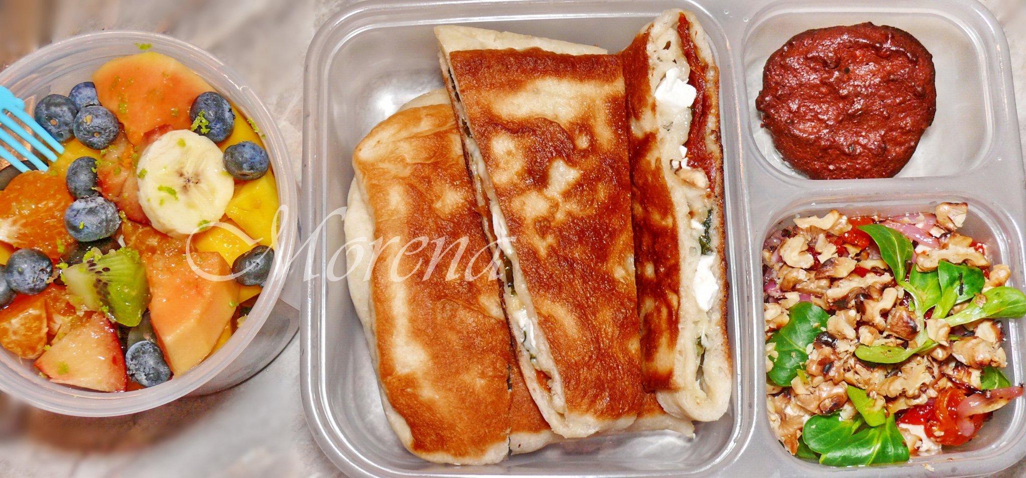 Гюзлеме със сушени домати, спанак, сирена и лешници; салата - печни чушки, грилован червен лук, Валериана, сирене и печени орехи с чеснов дресинг; домашна ръжена бисквитка с бадеми и какаови зърна