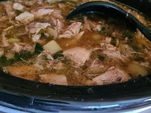 Супа от две джоланчета в бавноготвещата тенджера, с малко картофки, доматки, много целина и магданоз.
