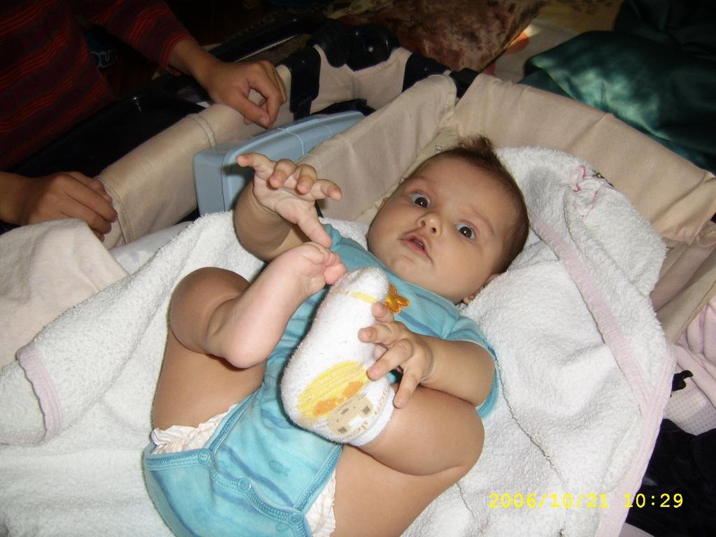 С беба сме още само на кърма, мисля да я караме така до 6-я месец. Не знам защо лентичката не показва вярно, но другата седмица ( на 25 ) ставаме на 5. Беба се научи да се обръща, но май не е много ентусиазирана да лежи по корем. Бърборенето й вече се променя - започва да се опитва да казва и срички. Преди няколко дни научи едно "тррр" с езика, пръска от многото слюнка и много си се радва на откритието.