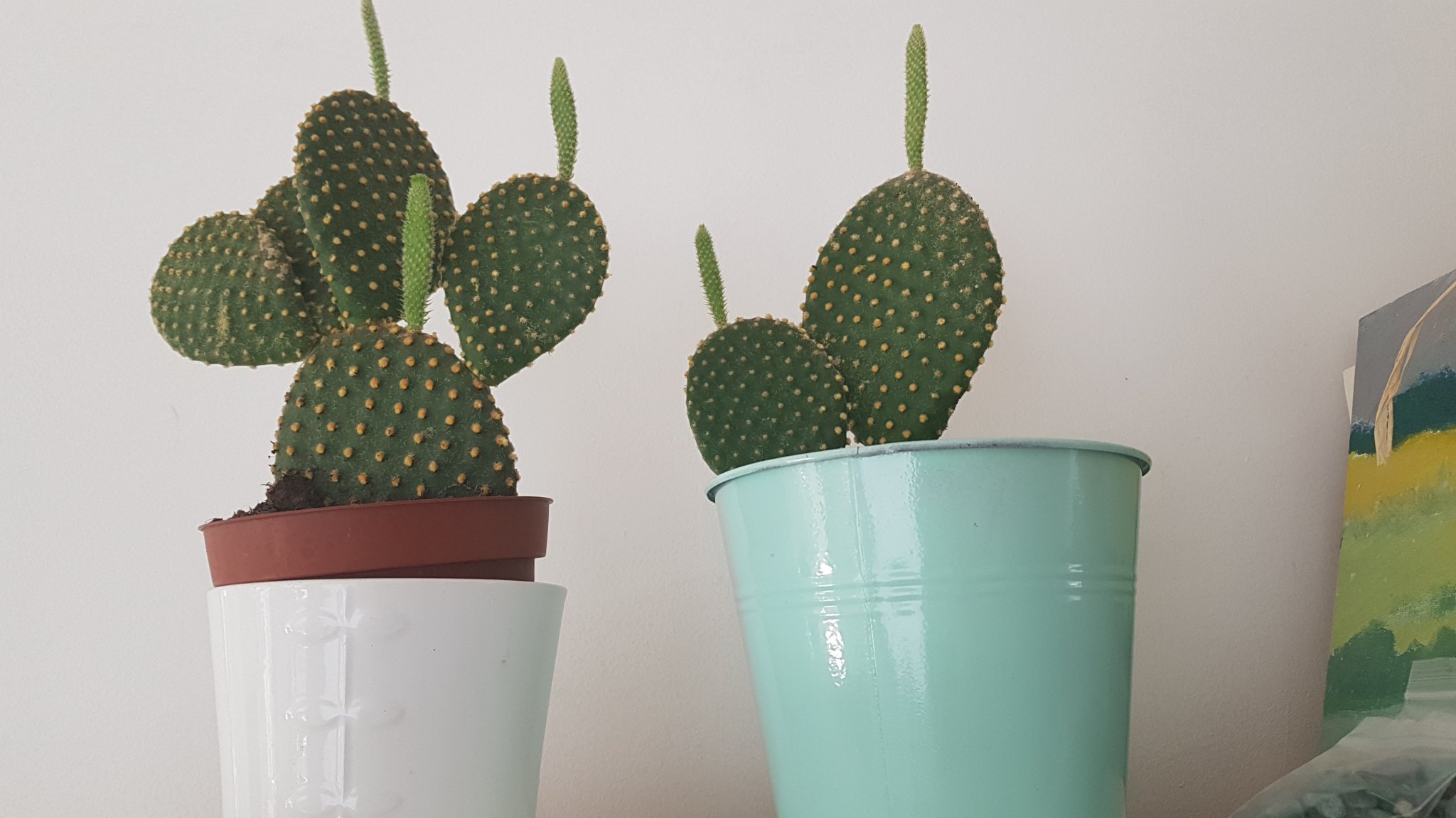 Аз имам три мини на перваза на прозореца и две опунции на недостъпно място.Тях и аз вече не смея да ги пипна без ръкавици,след като се поопарих.Докараха ми възпаление,алергия и болка,без дори да им пипам листата,само ги извадих от кашона,пипайки саксиите.Сега трябва да ги сложа в постоянното им място,ама се наканвам още Simple Smile Нависоко са,заради детето и Зак.