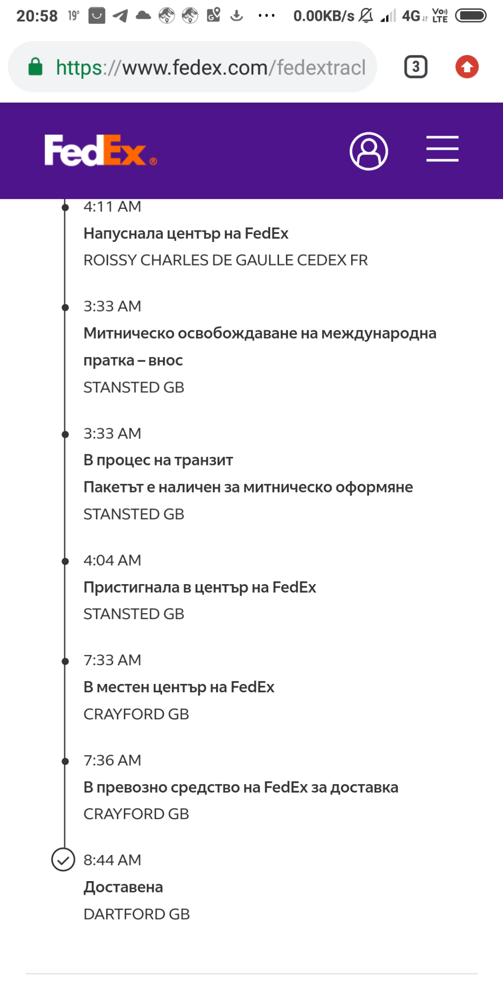 Абе била е спряна на митница в Лондон Станстед. Има номер за проследяване, там се вижда всичко