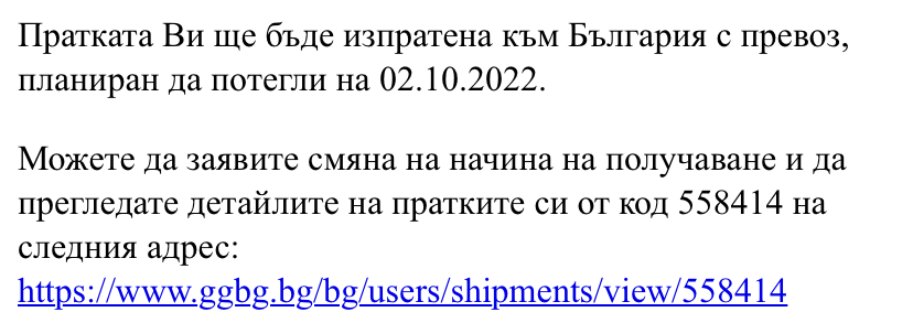 След имейла, който ви показах сутринта, платих и вече и от ggbg ми пратиха имейл, че са получили пратката и в неделя тръгва за България. Не вярва да е измама, как иначе ggbg ще ми пишат, че са получили пратка за мен🤔