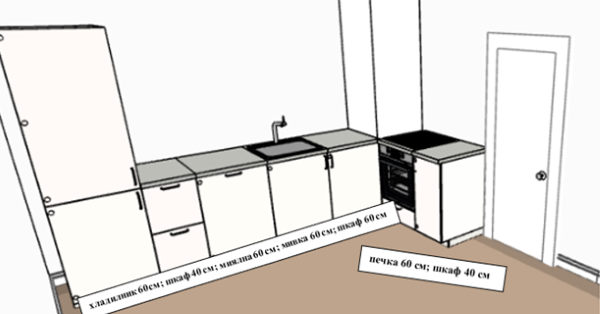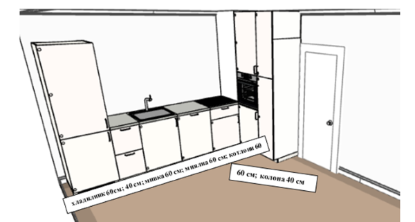 Кухня на стена 3.50 м. (минус широчината на комина около 60 см) може да побере хладилник, мивка, миялна и печка, а и имате удобна стена за още шкафове/плотове отстрани до вратата.