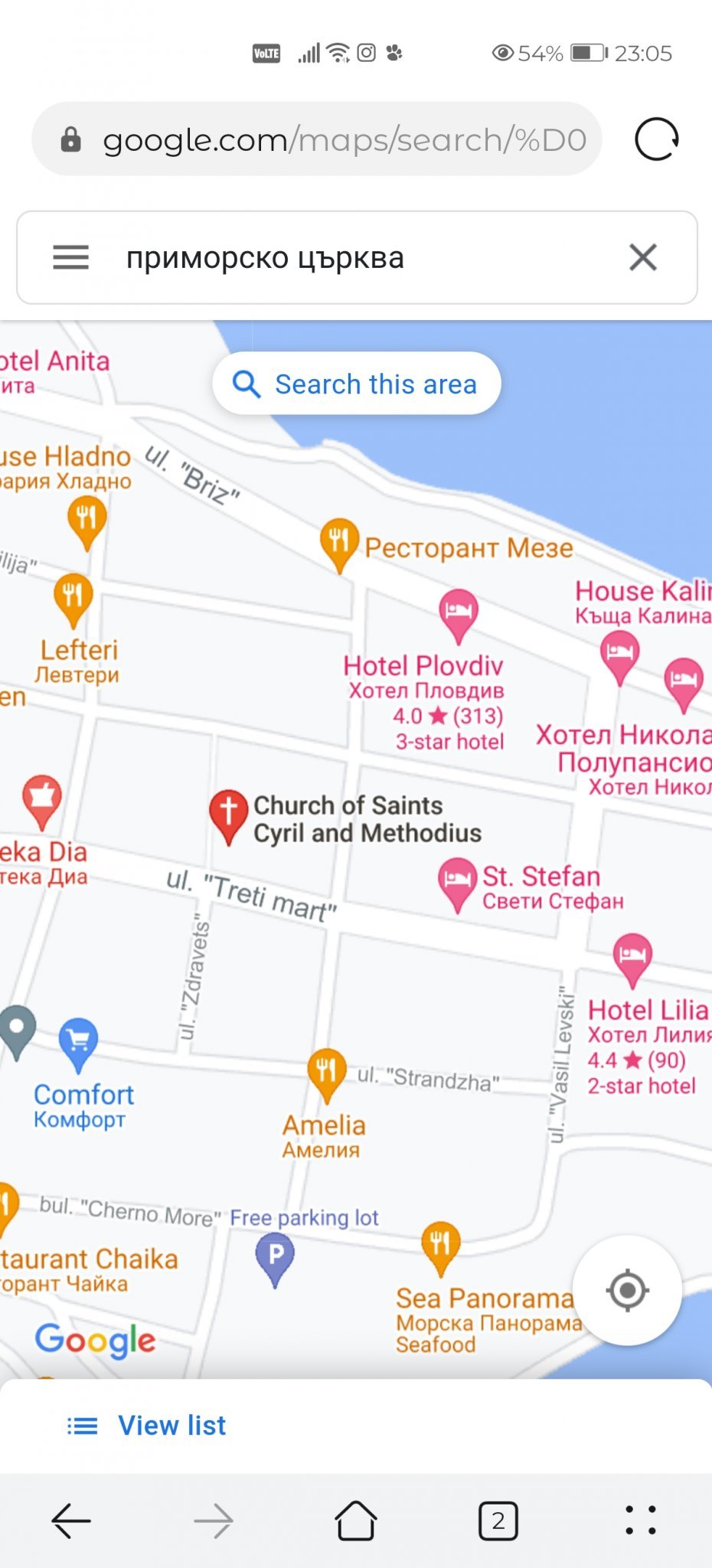 На картата както сте показали май се пада ул. Здравец . После , ако продължите само по нея ще излезете на един супермаркет добре зареден и пред него има зеленчуци и плодове , може да си вземете за стаята и децата, на плажа да си носите или каквото решите да си заредите. Вътре също е добре зареден на нормални цени мисля. Църквата и след нея май се падаше паркинга или не помня вече но дюнерите са пред паркинга отвън на уличката има каравана с 3-4 големи дървени маси, витрини хладилни и ще ги видите, на самата улица, заемат пространство и не е малко.