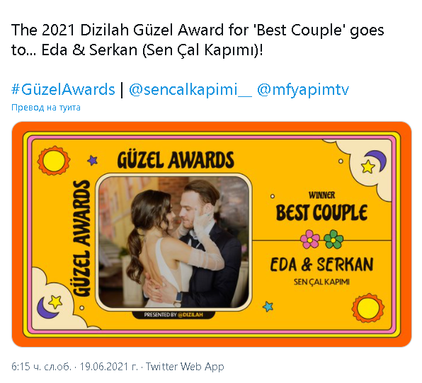 Наградата Dizilah Güzel за 2021 г. за „Най-добра двойка“ получава ... Eda & Serkan (Sen Çal Kapımı)!