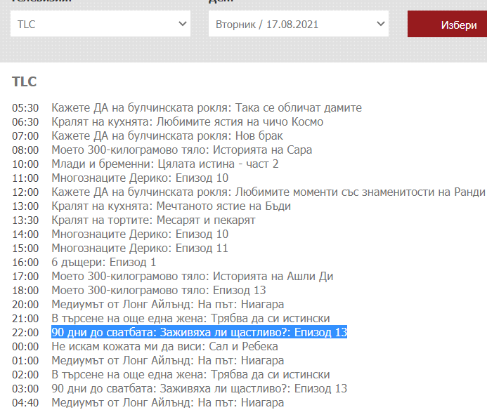 Вторник от 22.00 ч. е следващото повторение. Другият вариант е, ако имате IPTV с връщане до 7 дни назад, да си върнете на снощи 21.00 Wink
