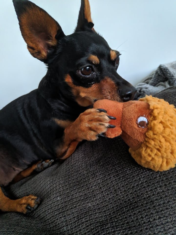 Ето една щастлива Буба, с новата си най-любима играчка на света Simple Smile Вчера минахме през новия зоомагазин (то е като хипермаркет направо; само не знам как може да нямат Орижен) в Младост и купихме играчка с миризма. Е, то радост, та чудо - преди да легнем снощи опита да си я скрие в дивана, а не беше "крила" нищо откак сме се преместили в къщата Grinning Преди, в квартирата, си "заравяше" само любимото дентално лакомство.