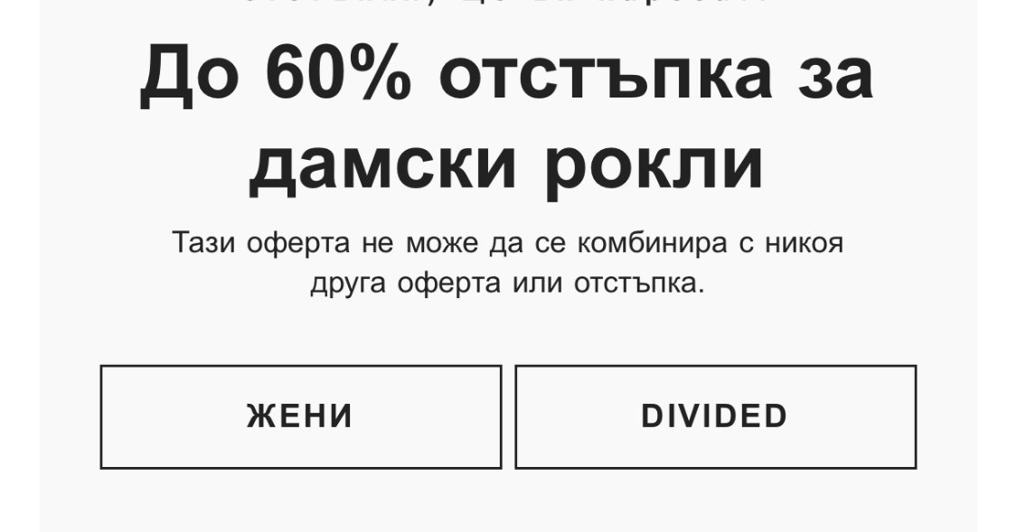 Магазините на H&M приемат връщания на стари дрехи, независимо от марката и състоянието им. Те предлагат талон за 15% отстъпка за продукт по избор при следващата покупка, ако общата сума е над 40 лв. Всеки клиент може да върне до две торби на ден и да получи два ваучера. Отстъпката може да се използва и за артикули с намаление.