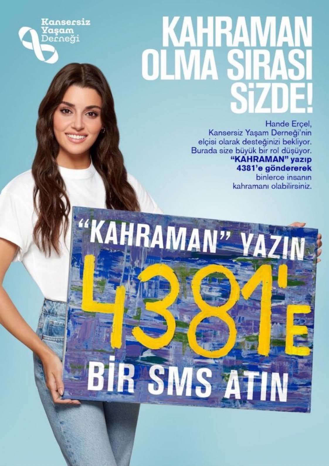 Hande Erçel очаква вашата подкрепа като посланик на Асоциацията за свободен живот от рак. Имате страхотна роля тук. Можете да станете герой на хиляди хора, като напишете „KAHRAMAN“ (герой) и го изпратите на 4381. “