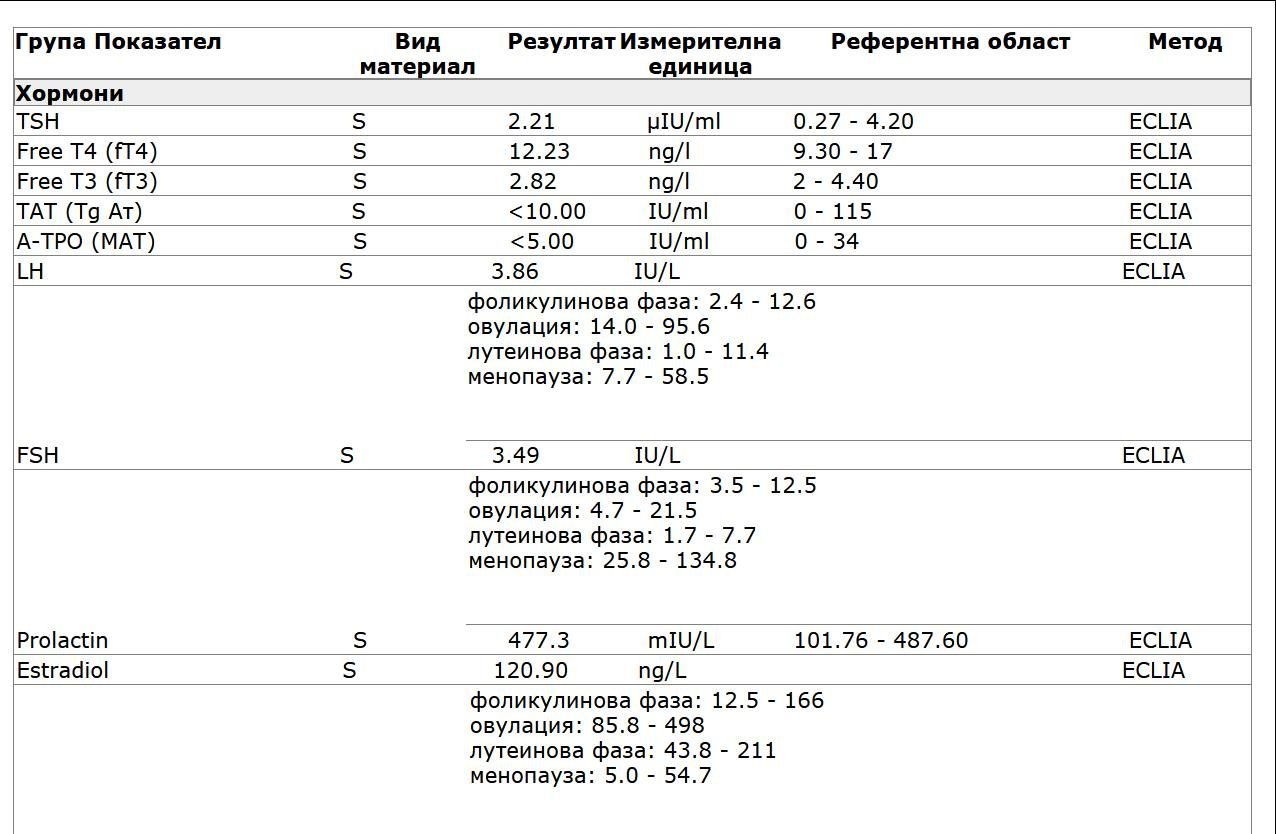 FT 3, FT4, TSH, Testosterone, Естрадиол. LH, FSH и 4-андростендион са в норма.