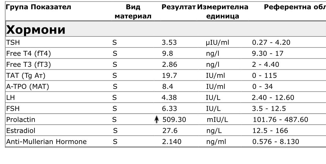 Пролактинът е висок.. много вероятно, да е от по-високия ТСХ ... но е желателно да се провери Андростендион, Тестостерон, ДХЕА и 17ОН Прогестерон ( на 3 ден от МЦ) и да се направи тест за ИР.