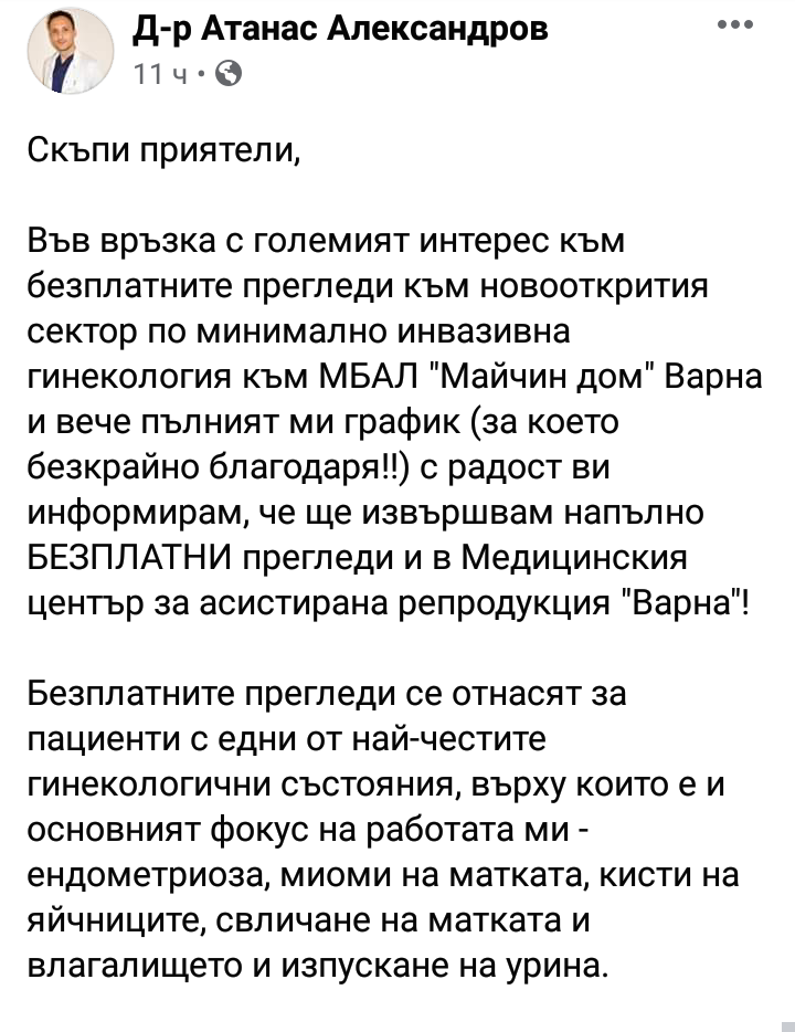 Момичета,прочетохте ли за безплатните прегледи,които ще извършва д-р Александров младши през септември?Аз смятам да се възползвам.Браво на нашия доктор!Малко са лекарите като него.