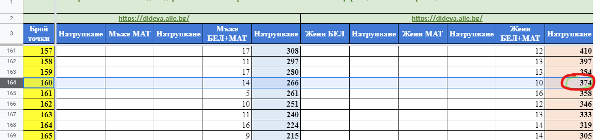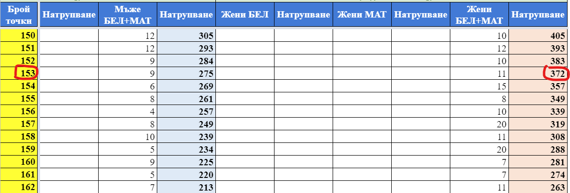 Сега отиваме в статистиката за 2020 и гледаме на какъв сбор са отговаряли тези 374 момичета с по-висок сбор от нас - на сбор 153 е имало 372 момичета над нас: