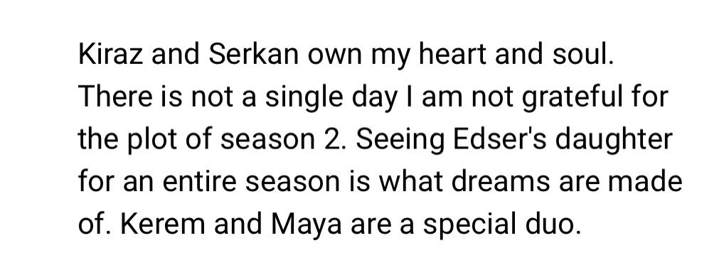 “Кираз и Серкан притежават сърцето и душата ми. Няма ден, в който да не съм благодарна за сюжета на сезон 2. Да гледам дъщерята на Едсер цял един сезон е сбъдната мечта. Керем и Мая са специално дуо.” Revolving Hearts