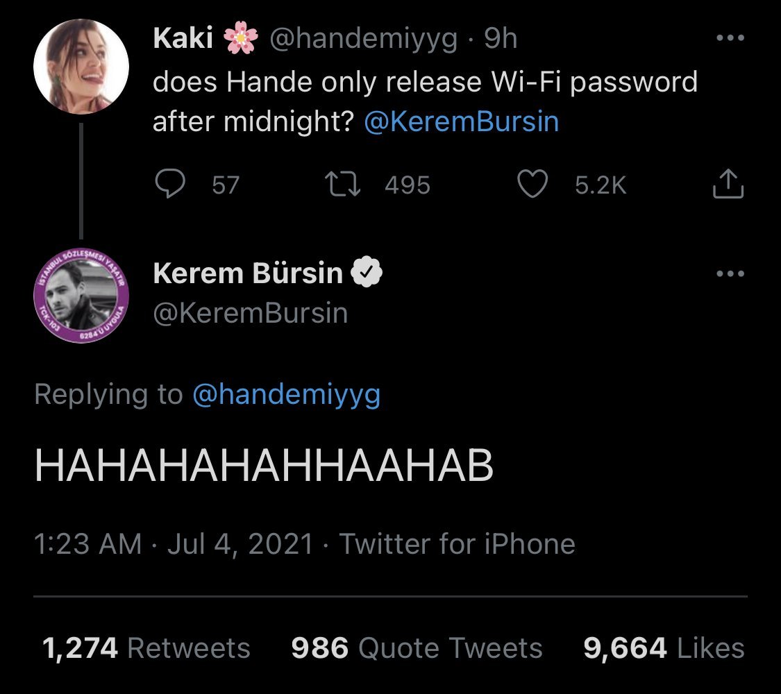 В Туитър снощи Керем отново е бил активен след полунощ и фенове са се пошегували с него, че явно Ханде споделя паролата за Уай Фай-а само след 00 часа. На което той е отговорил, смеейки се. За феновете, разбира се, това означавало, че си признава, че живеят заедно. Wink