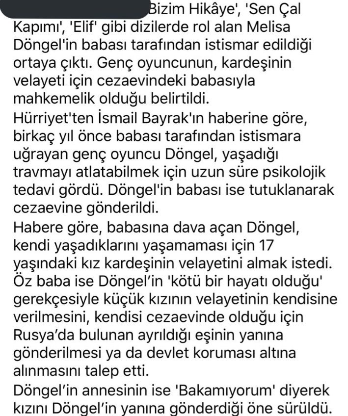 "Според журналиста Исмаил Байрак от Hürriyet, Мелиса Донгел е завела дело срещу баща си, който е в ареста, с искане да го лиши от родителски права и да прехвърли попечителството над 17-годишната си сестра. Както се оказа, Мелиса беше изнасилена от баща си, който получи значителна присъда в затвора. Момичето дълго време е било лекувано от психолог и сега е решено да защити сестра си, за да не й се случи същото. Майка им отказала да се грижи за дъщерите им под предлог на липса на средства и заминала за родината си в Русия. След това бащата реши да прехвърли дъщеря си на грижите на държавата, но това изобщо не устройва Мелиса и тя няма да й позволи да заведе сестра си в сиропиталище."