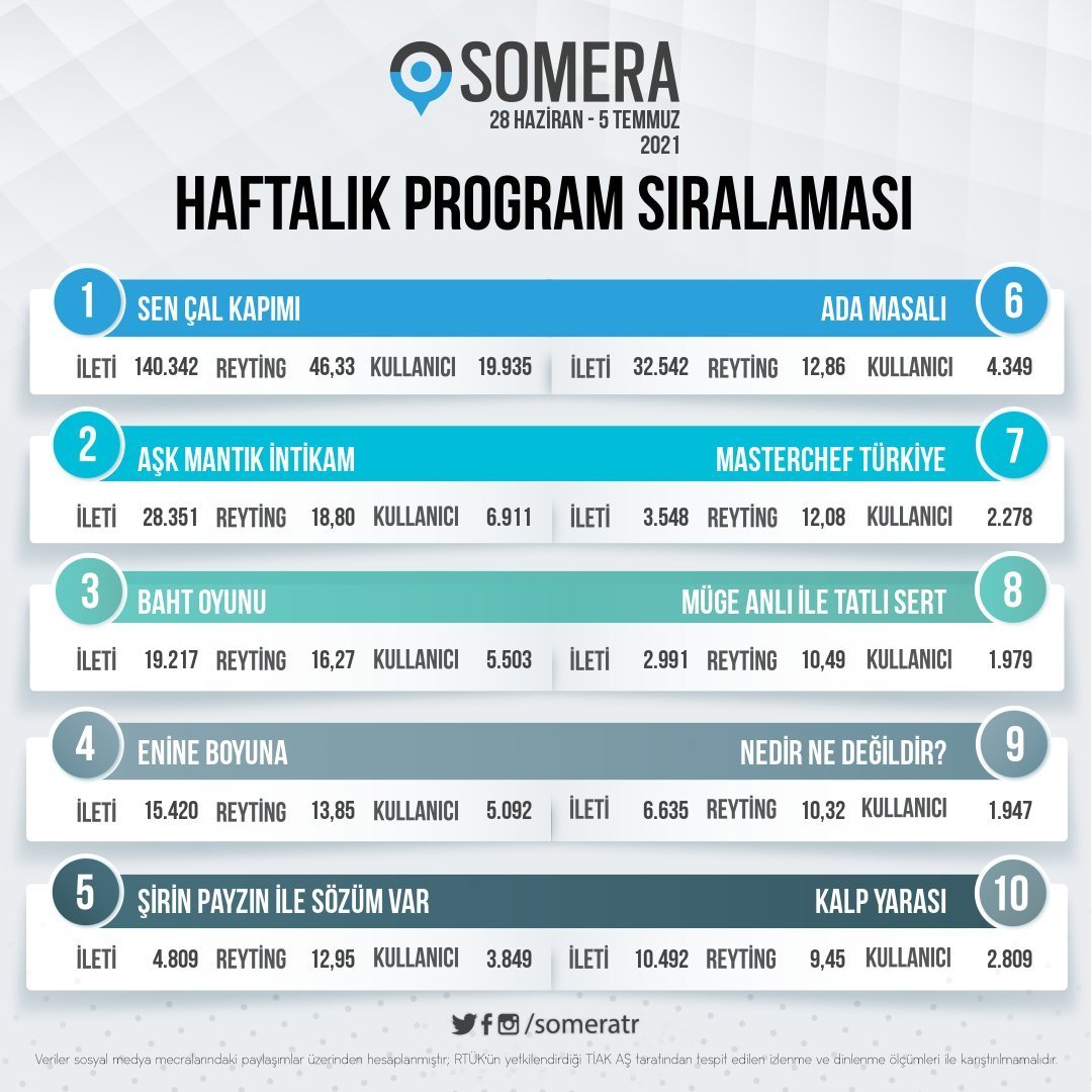 Според рейтингите на Somera в социалните медии е обявено класирането на програмата от 28 юни - 5 юли