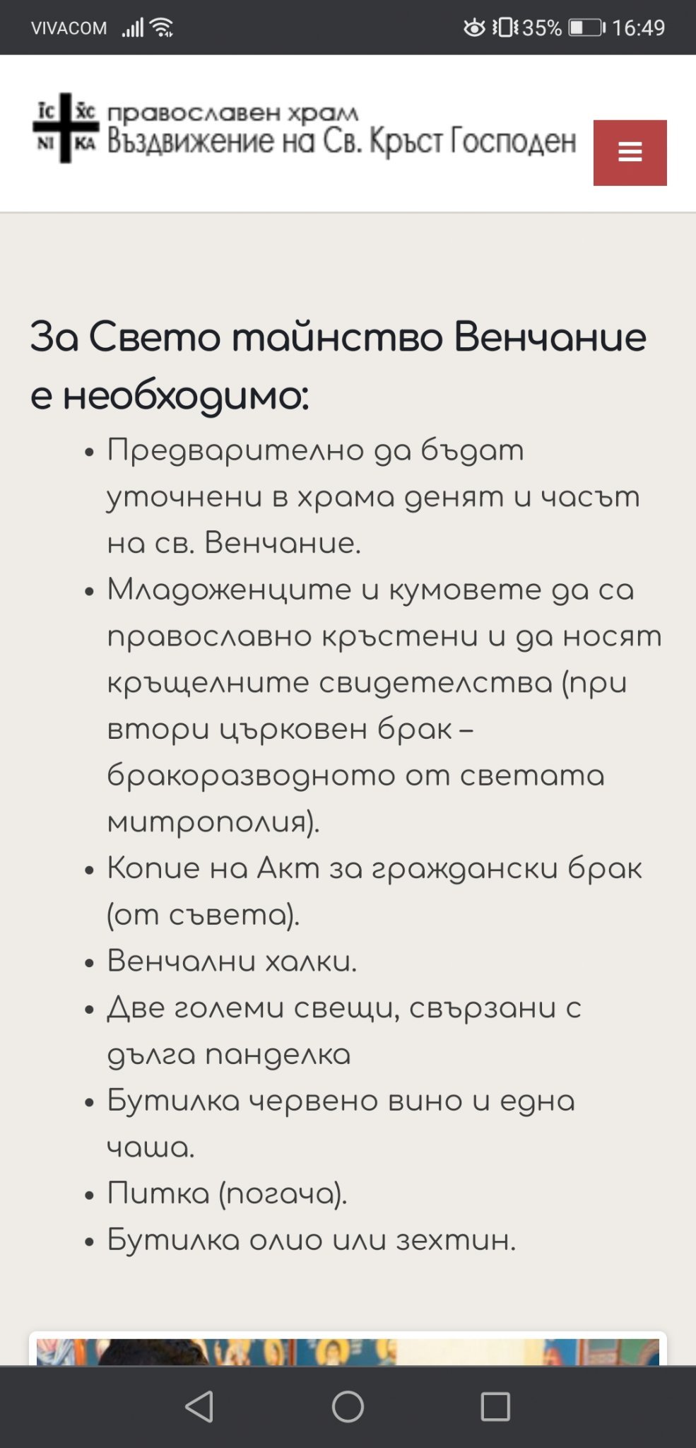 Посреща ни свещеник. Вижда в тефтер си, че желаният час от нас 16.00 е зает. Започва да се чуди какво да прави?!? Аз му казах:" няма проблем, тръгваме си" , а той отвърна:елате преди гражданския?!? Аз се шокирах! Питах го за свидетелството, не им ли е нужно?! Той ме увери да не се притеснявам, нали ми казвал, че може...?!?!?!