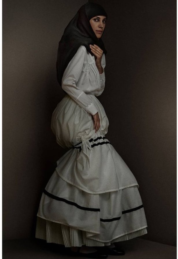 Шалът (да кажем), макар и черен, е бил от коприна, т.е., лека и луксозна тъкан, която подчертава формата на тялото. На пръв поглед полата е много обемна, но пък оформяла тънка талия и откривала глезените при движение. Нагоре често са носели светла, по-тънка и прилепнала горна част (корсаж или риза), която откривала ръцете, дори ако била с дълги ръкави. Така де, дори не особено "вълнистите" (като Саса😉) са можели да докарат вълнуващият тогавашните мъже силует на пясъчен часовник.