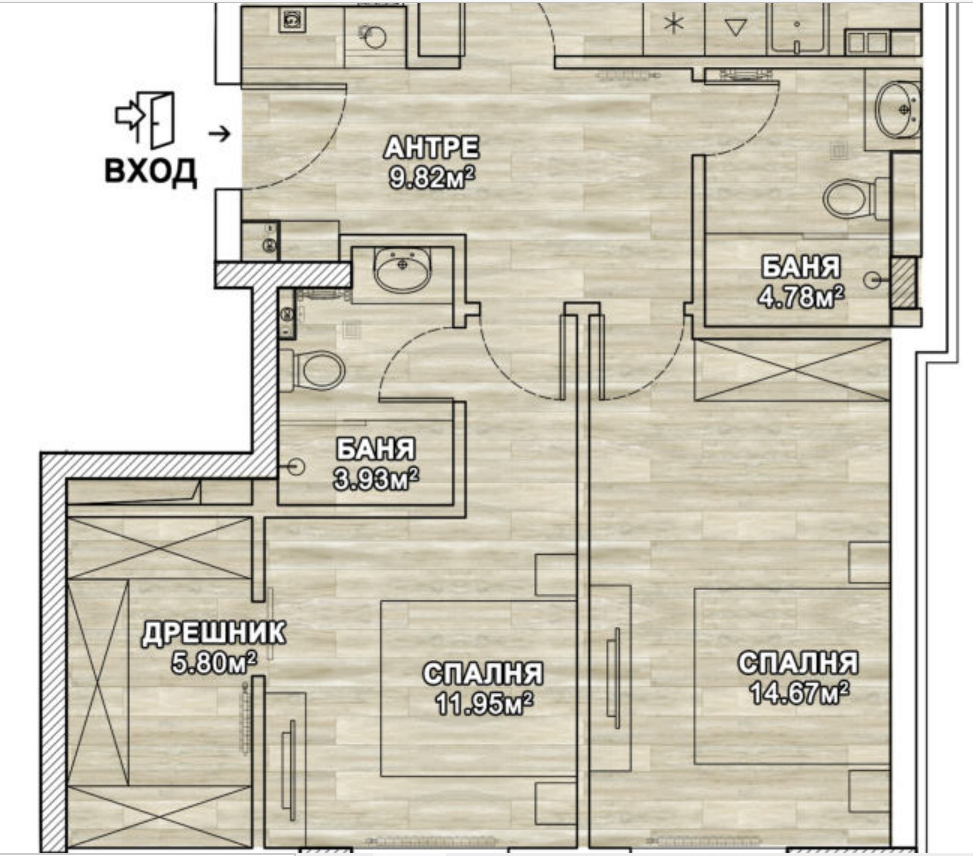 Вляво от антрето е хола, който не е в скицата, но е малък и няма какво да се направи там. Тъй като едната ( родителската) спалня е доста малка, единият ни вариант е да махнем тази баня и от нея половината да вземем в спалнята, а другата част да остане мокро помещение.. Най-функционално е , но никак не ми се иска да се лиша от тази баня. Какво бихте направили? Нямаме мазе и ще има доста неща, които все някъде трябва да се приберат.