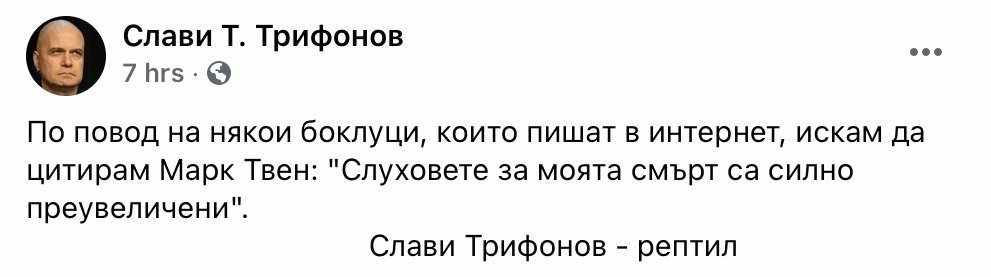 Гадно и цинично е цяла година да говорят как вирус няма, как това е грипче и сега паничката като се обърна, да търчат в частната клиника. И това не го приказва някой на маса пред блока, а човек с ефирно време от десетилетия. Искрено му желая да се оправи, на никого не пожелавам зло, ако слуховете за МС са верни, се надявам да държи под контрол болестта. Но в същото време смятам, че той и екипът му са лично отговорни за това много хора да не вярват в сериозността на вируса, да не се пазят и после да откажат да се ваксинират.