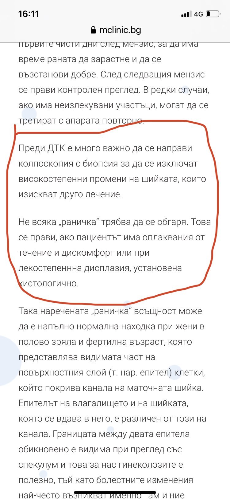 И в заключение ще кажа, че лично съм го изпитала върху себе си и накрая пак стигнах до операционната маса.Добре, че се усетих и почнах да чета за проблема, иначе дъгогодишния ми АГ , на когото имах доверие, смяташе, че нищо ми няма и давай да горим.Слава богу навреме се усетих, смених го, и съм жива и здрава.Това беше първият път, изгориха ме без никакви изследвания , само една цитонамазка ПАП 2.
