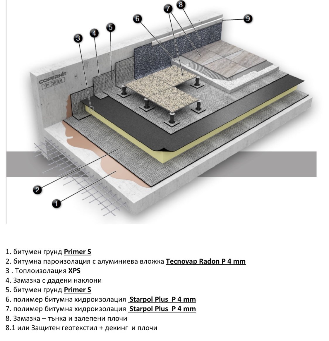 Ако остане открита тераса е много важно отводняването и наклоните. Иначе битумна изолация и покритие по желание - гранитогрес или декинг. Искаш ли да ти изпратя слоевете при битумната хидроизолация ? И трябва да се топлоизолира, което ще е проблем при така поставената дограма отдолу..
