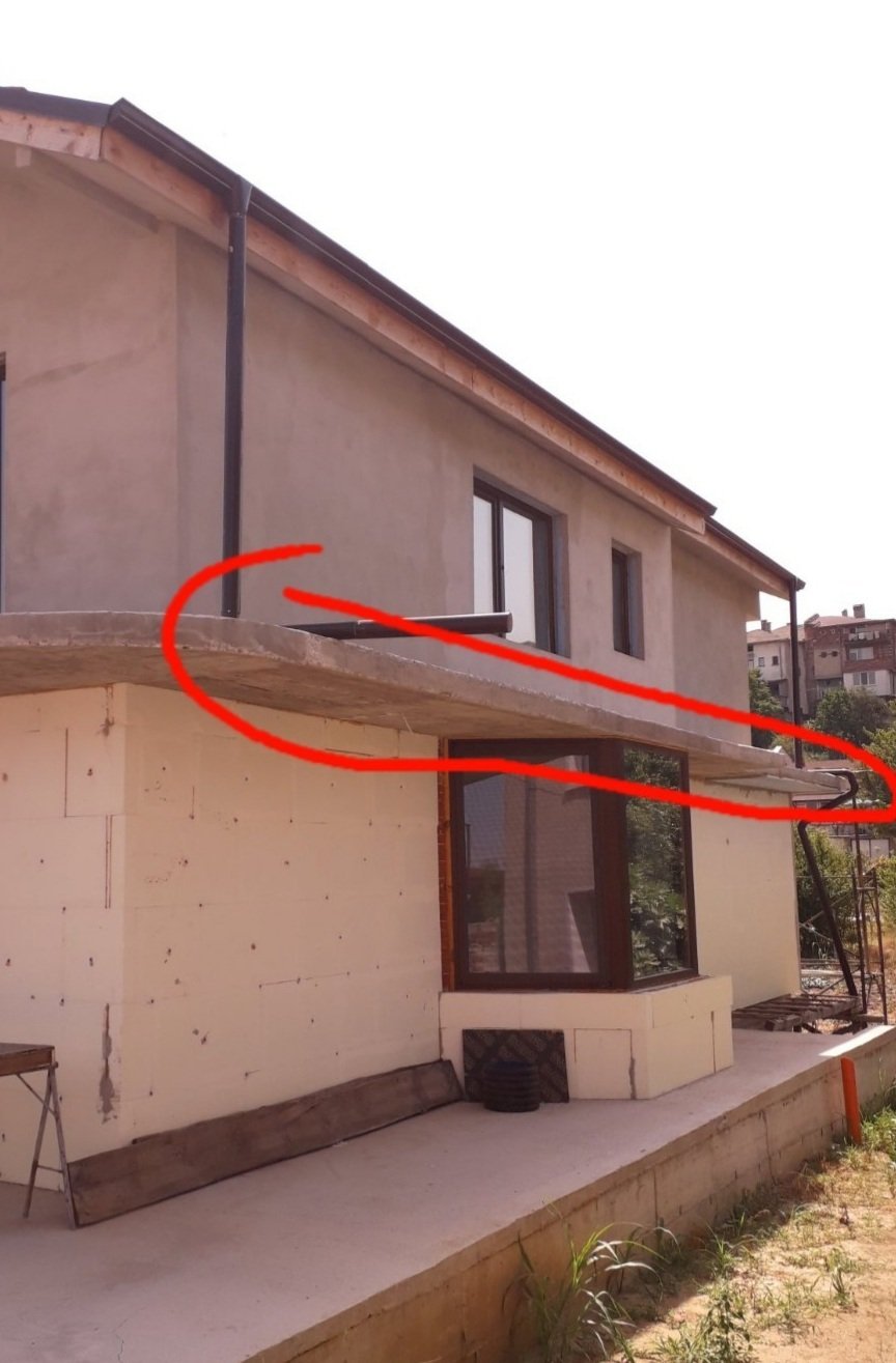 Според вас тук (ограденото в червено) какво може да се направи. Тази козерка, принципно по план е заложено да бъде покрита с керемиди, но аз отказах, защото се обособява страхотна тераса, която обикаля цялата къща и има гледка към планината. Та съм в чуденка с какво да я покрия, за да е естетически красиво и да не вали дъжд.