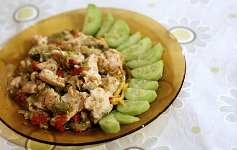 Гърдичките ги сложих в Шейкър-кана.Прибваих счукан чесън,копър,извара и едно яйце,черен пипер,кимион и малко сол.Разбих ги добре.Добавих малко трици и ги направих в тефлонов тиган.Станаха мозък.А ето и снимчица: