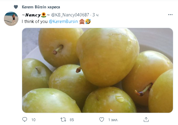 Керем е лайкнал един пост на фен с чувство за хумор, който му изпраща от любимите сливи и е написал: "Аз мисля за теб, Керем Бюрсин"