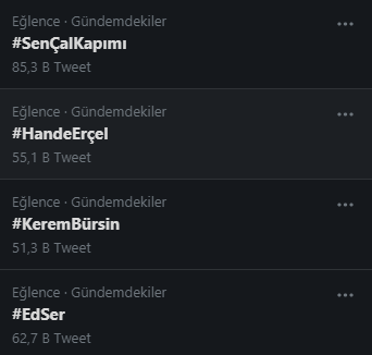 Днес се движим бавно в туитър. Обаче в тренда на Турция освен хаштагът на епизода са и #KeremBürsin, #SenÇalKapımı, #HandeErçel и #EdSer.Two Hearts Пожелавам ви приятно гледане. Аз съм се приготвила за много весел епизод, само дано краят да не е драма и да чакаме 2 седмици, за да видим какво ще се случи.