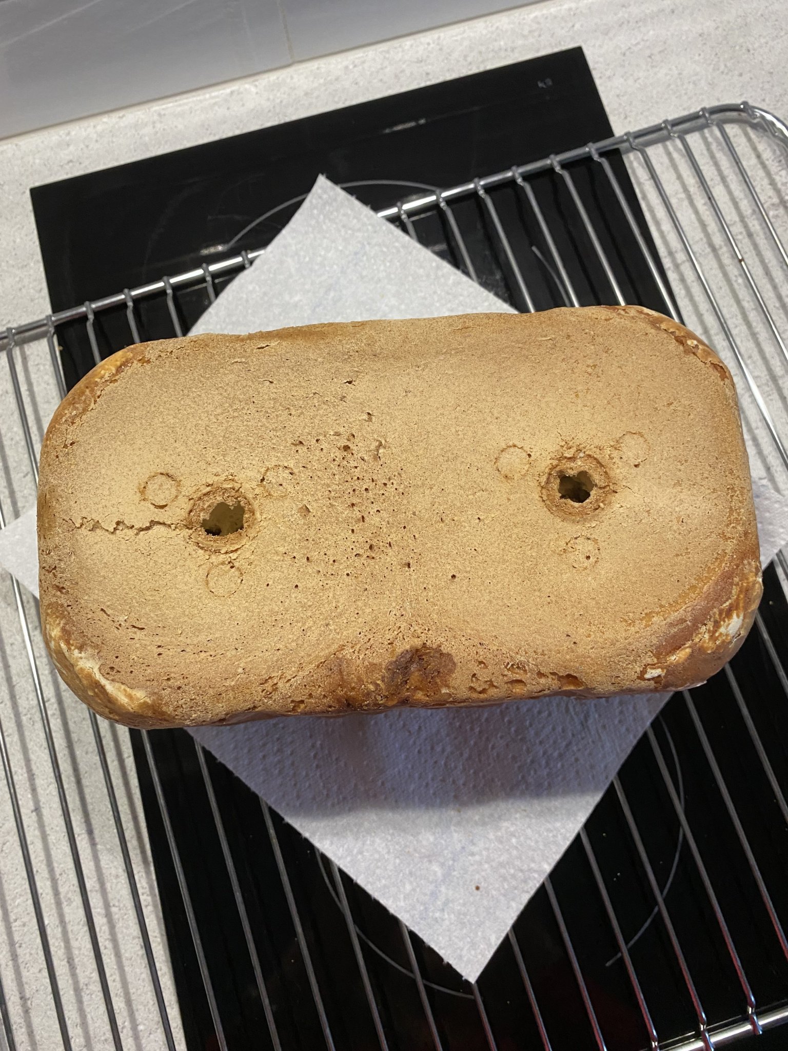Добавям снимка на днешния хляб. Тъмното петно от едната дълга страна е мокро, което още не може да изсъхне (4 часа вече)
