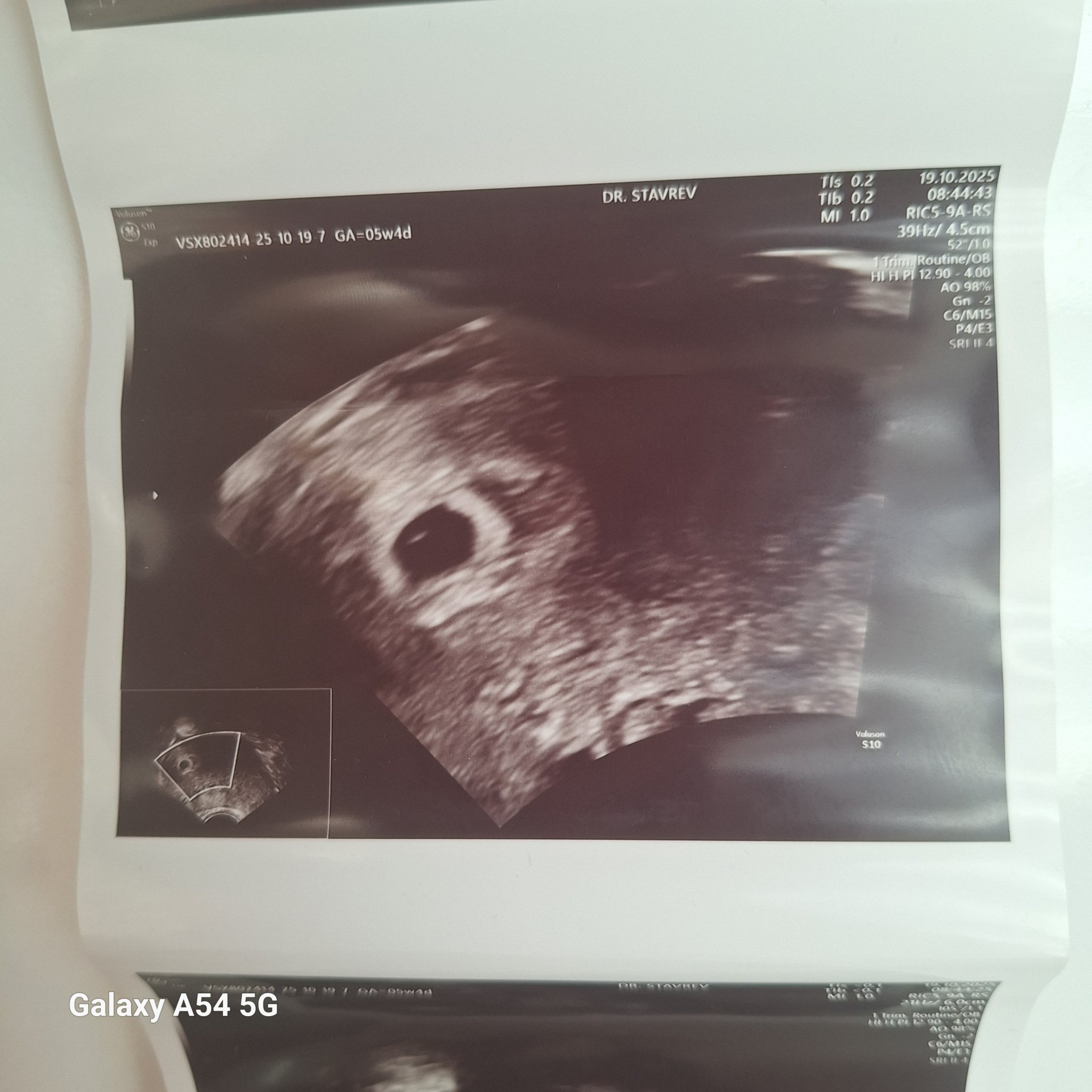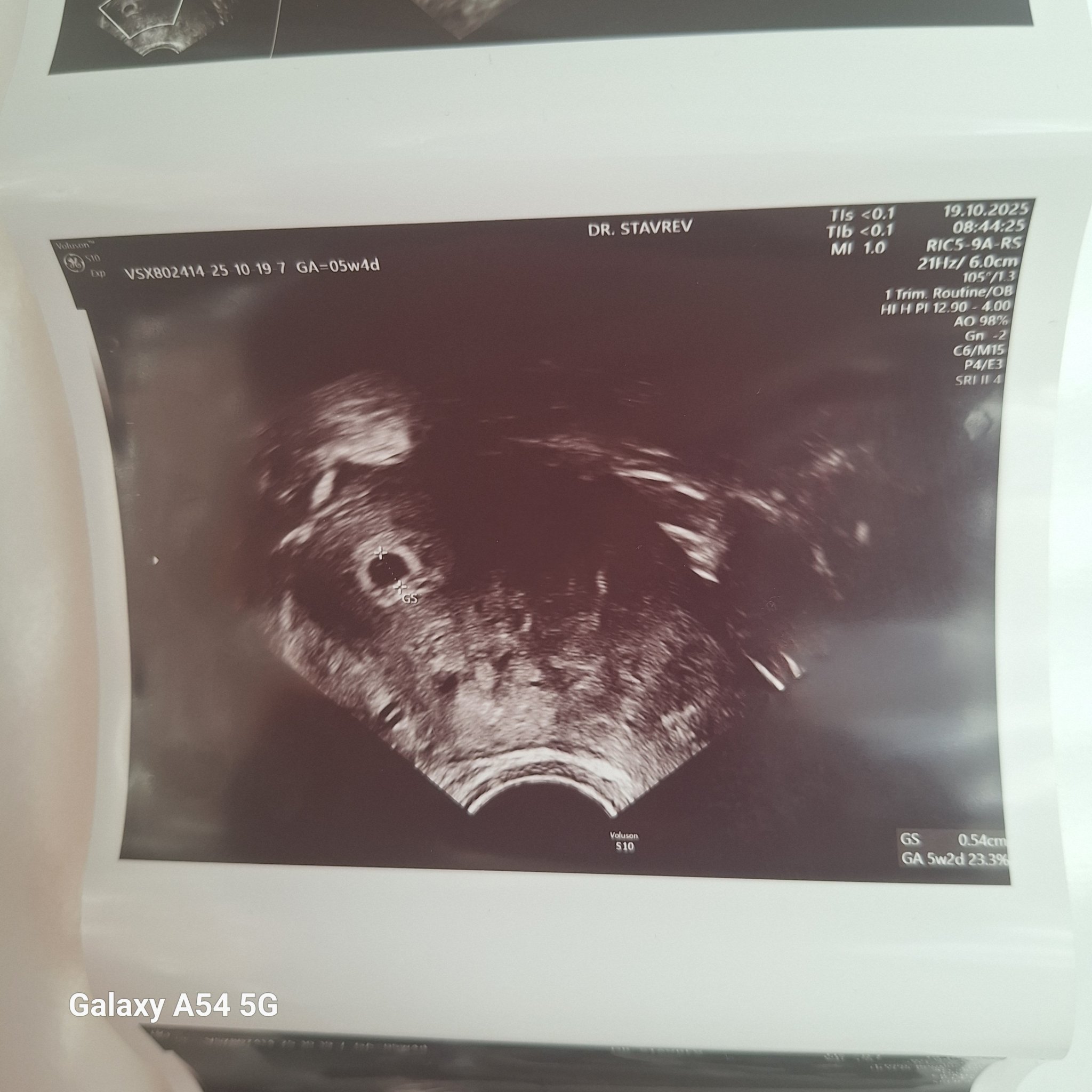 Здравейте, момичета! Имам нужда от вашата помощ. Днес бях на преглед за потвърждение на бременност, потвърдена е... Но доктора беше изключително груб, не ме гледа вагинално, само коремно, не ми каза в коя седмица съм. Каза че не вижда ембрион, а на мен сякаш ми се вижда. Последния цикъл ми беше на 28 август. Моля, дайте вашето мнение относно седмиците и снимката.