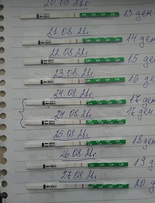 Привет, момичета! Знам, че по принцип втората черта на теста трябва да е по-ярка или колкото контролната на цвят, но откакто се тествам, никога не се е появявала такава. Най-близкото до положителен е на 24.08 , според вас дали е наистина положителен или няма овулация до момента?