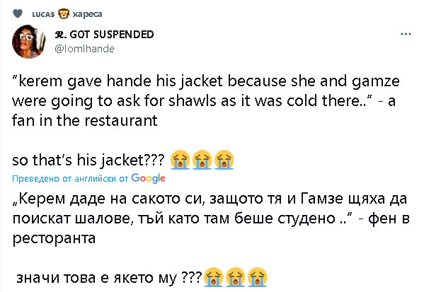 Посетители на същият ресторант , в който снощи са били Ханде и Керем коментират, че Керем е дал сакото си на Ханде, да се наметне, защото е било хладно. Там вечер обикновено си подухва.  Кавалер си ни е Керемчик. Пази си момичето да не настине.